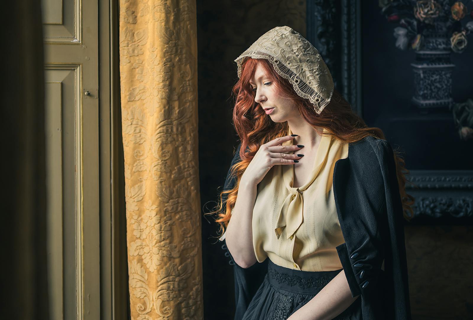 Vervolgens duiken we de studio in, waar Ursula twee schitterende sets voor ons heeft ingericht. Eentje met een barokke sfeer, waar we model Stephanie gaan vastleggen die in delicate stijl is gekleed. En in de serre met veel daglicht en mooie vitrages vinden we model Vivian, die een prachtige zwarte jurk draagt. We fotograferen vandaag met alleen daglicht, dat prachtig door de grote ramen naar binnen valt.